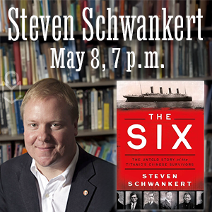 Graphic for an event featuring the author Steven Schwankert and his book, "The Six: The Untold Story of the Titanic's Chinese Survivors" on May 8, 7-8 p.m.